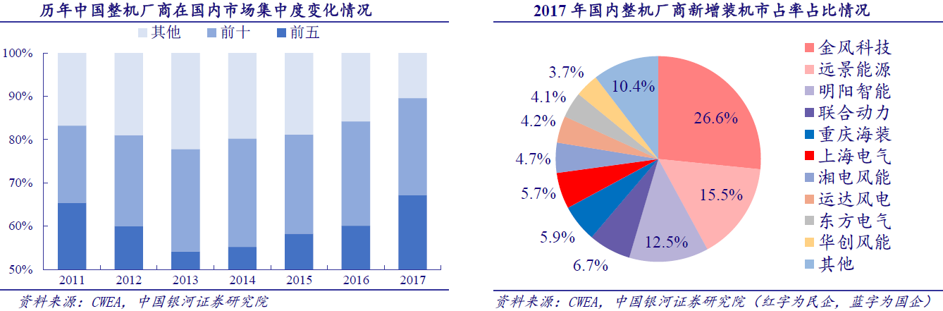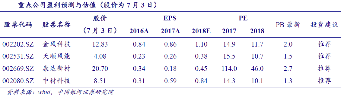 银河证券认为,中游率先吹响复苏号角,下游盈利能力提升明显。下游产业集中度高,大型国企居多,议价能力最强,装机受政策制约。整机价格持续下移,中游整机厂商毛利率承受较大压力,但可向上游传导。上游零部件厂商竞争较激烈,市场较分散。由于2017年下半年招标量数据先行,中游率先吹响复苏号角。2018年随着弃风率、风电利用率逐步改善,下游盈利能力提升显著。