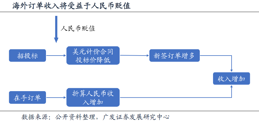 ①助力新签和在手订单转化收入,海外收入或将有所增加。人民币贬值将从新签订单和在手订单两方面增加公司海外订单收入。对于未进行招投标的新签订单来讲,人民币贬值将使以美元报价的订单金额相对变低,从而提升订单的投标竞争力;对于在手订单而言,虽然以美元计价的订单收入不变,但是人民币贬值后折算成人民币的订单收入将更多。