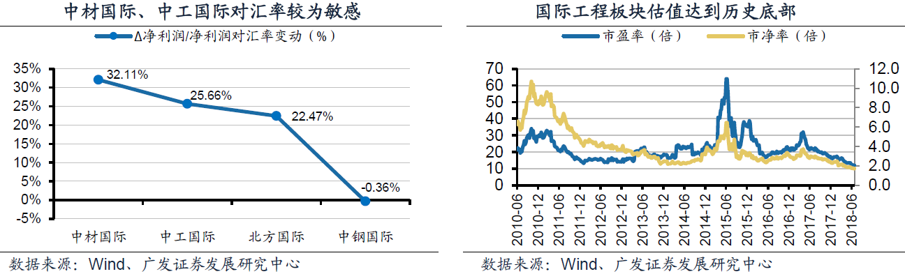 广发证券建议关注业绩弹性较大的低估值国际工程公司。将国际工程板块内净利润进行调整,用去除汇兑损益前后的归母净利润变化值/净利润作为公司的敏感度,测算发现中材国际与中工国际对汇率较为敏感,若人民币处于贬值期间,预计公司业绩提升较为明显。