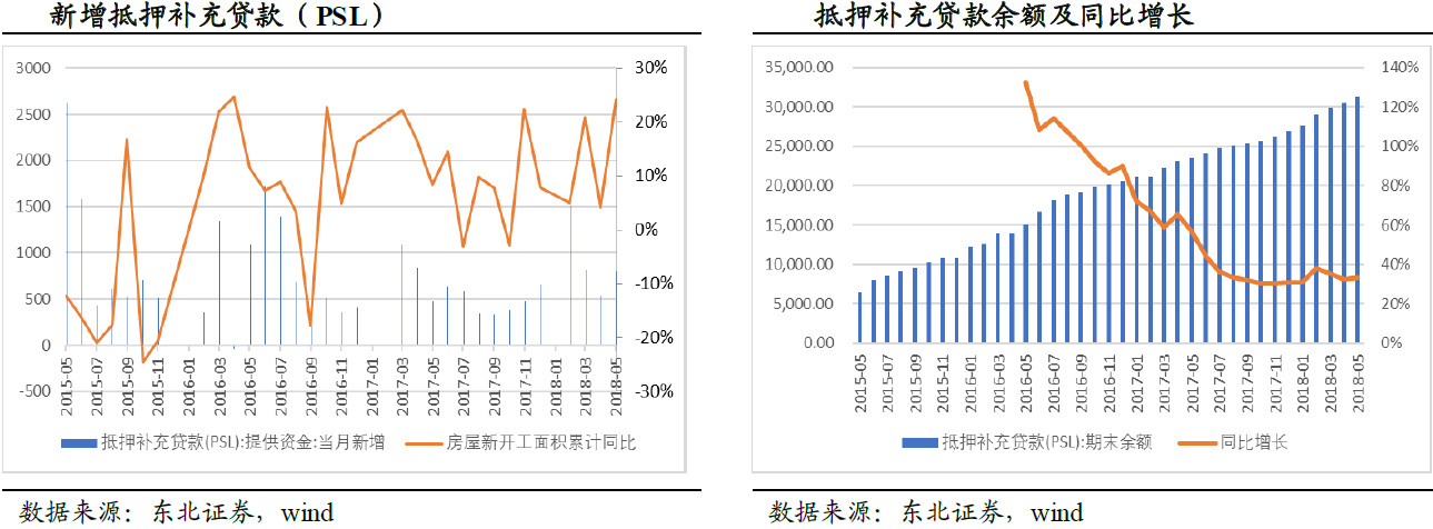 为缓解货币化安置给政府带来的支付压力,央行创设抵押补充贷款(PSL)为棚改提供长期低利率的资金支持。2018年上半年,新增抵押补充贷款为4976亿元,同比上涨约64%,占2017年全年新增额的78.36%,发放节奏较快。