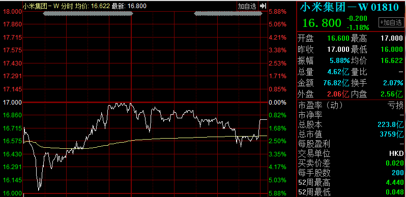 7月9日小米集团正式登陆港交所,股票代码1810.HK,开盘价16.6港元,较发行价17港元下跌2.35%,惨遭破发。截至收盘,小米股价报16.8港元,较开盘价下跌1.18%,总市值约3759亿港元。