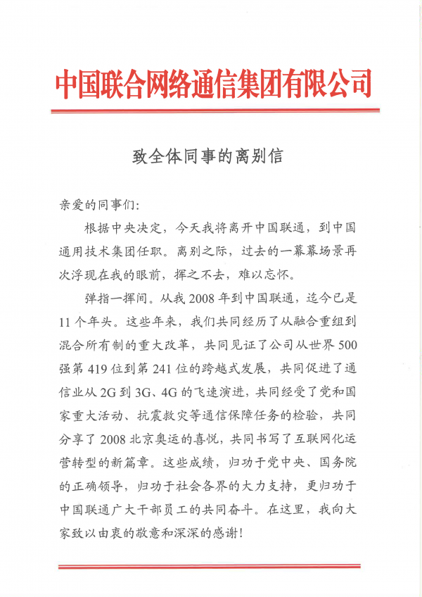 当天上午,中国联通举行了陆益民的欢送仪式。在致全体同事的离别信中,陆益民表示,将离开中国联通,到中国通用技术集团任职。陆益民称,从2008年加入联通,迄今已经11年。