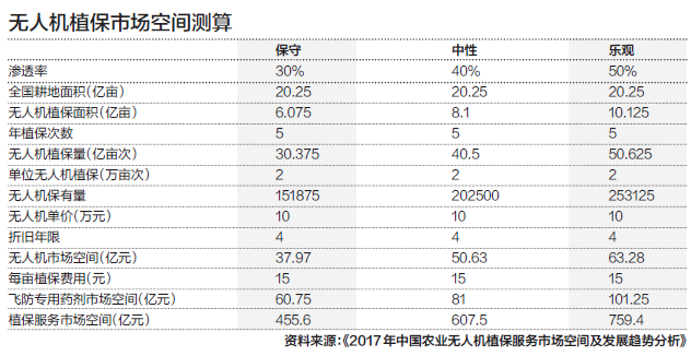 和传统作业方式相比,植保机的优势是明显的。宏信证券一份研报指出,植保机作业效率是传统地面机械的3倍左右,人工的30倍左右,作业效果与人工相比,可节省农药50%,节省用水90%,操作人员可远离农药。可直到2017年1月,农业植保还是以人工加手动、电动喷雾机为主,两种作业方式占比超过90%。