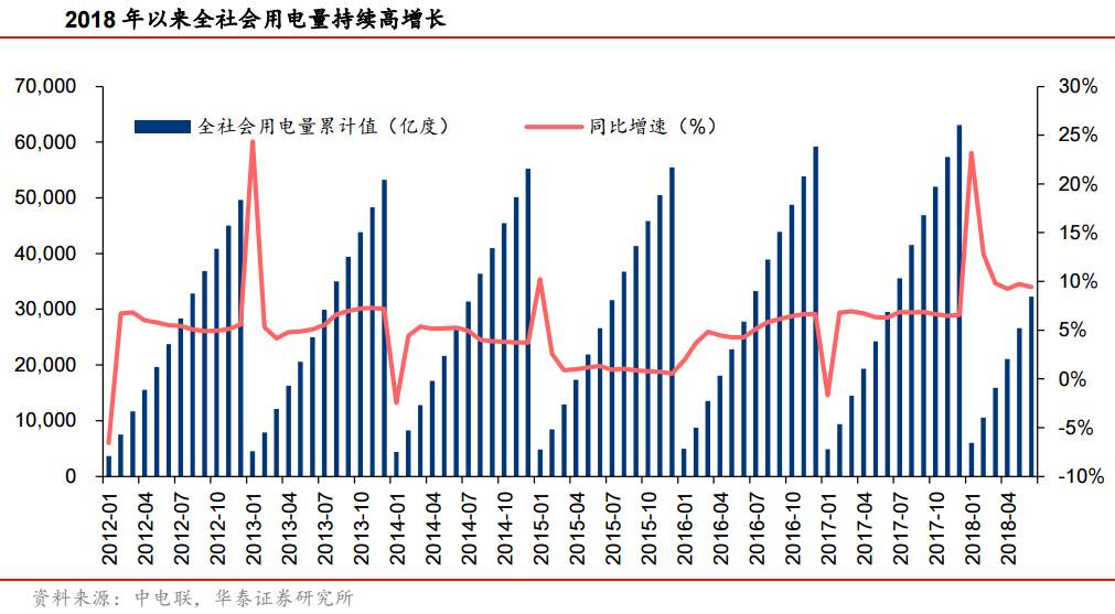 根据国家能源局近日公布的数据,2018年前六个月全社会用电量累计32291亿千瓦时,同比增长9.4%,增速创2012年以来新高。其中,第二产业为增量用电需求的贡献主体,第三产业和居民端在增量用电需求中增长趋势快,经济新动能尽显。由此,华泰证券判断电力需求韧性持续增强,看好未来电力需求的持续放量。