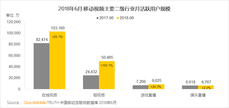 上半年,短视频行业用户规模同比翻番,突破5亿。这意味着平均每2个互联网用户就有1人使用短视频APP,增长势头远超移动直播。得益于短视频增长拉动,2018年上半年移动视频行业渗透率超95%。