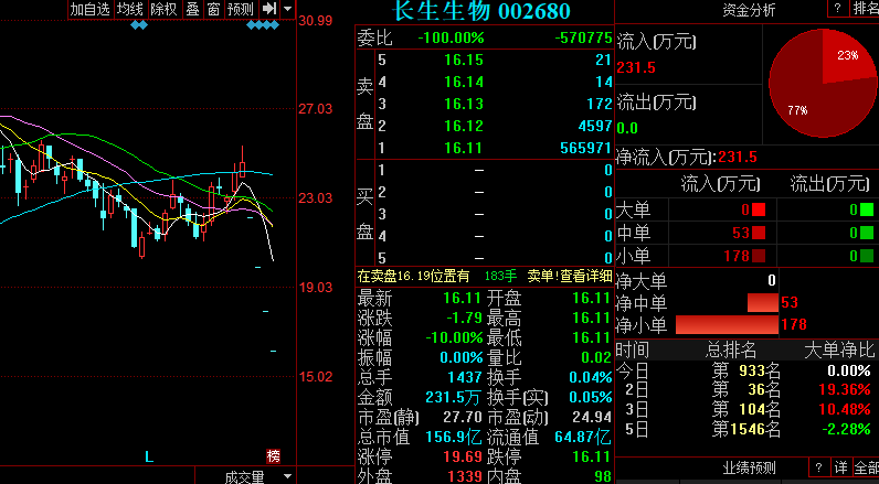 截至今日,长生生物连续四日跌停,股价收报16.11元,总市值156.9亿元。