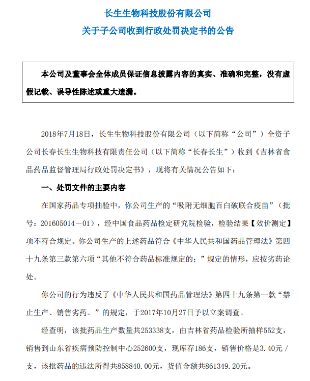 长生生物7月19日晚公告,7月18日,公司全资子公司长春长生收到《吉林省食品药品监督管理局行政处罚决定书》,吉林省食品药品监督管理局决定对长春长生给予罚没款总计3442887.60元。