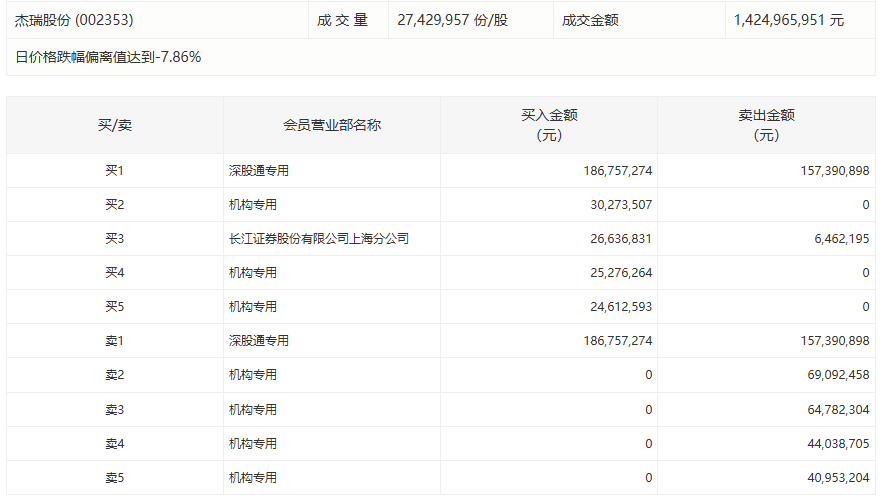 杰瑞股份今日跌7.46%,有4家机构专用席位净卖出2.19亿元