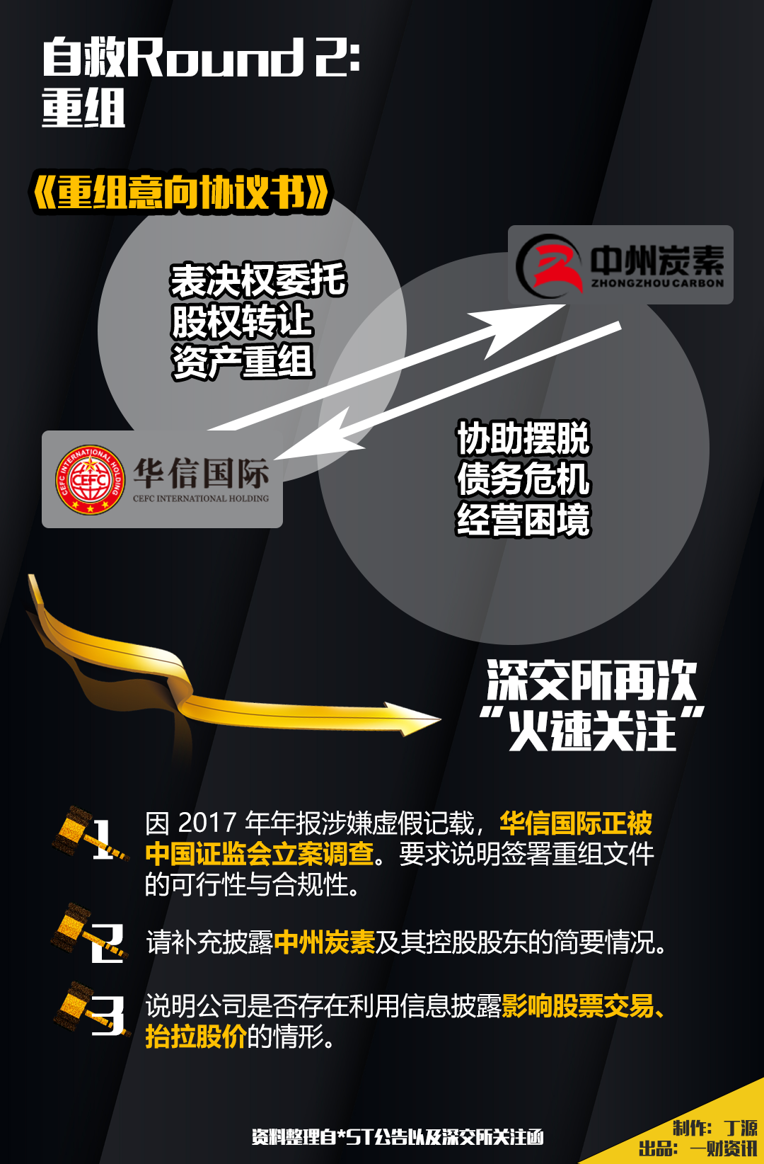 “债务抵消”方案破产后,8月8日晚,*ST华信向市场再度抛出一个重磅“利好”——其公告称,公司已与中州炭素签订《重组意向协议书》,就由中州炭素协调帮助公司摆脱债务危机等事宜达成合作意向。为使公司尽早摆脱债务危机和经营困境,中州炭素积极与公司沟通、商定,拟尽快签署包括但不限于《表决权委托协议》、《股权转让协议》、《资产重组协议》等必要的重组文件。
