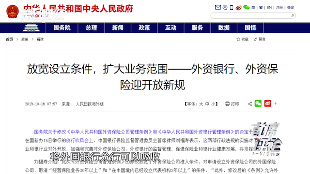 2019年10月中旬完成修改的《外资银行管理条例》扩大了外资银行的业务范围,增加“代理发行、代理兑付、承销政府债券”和“代理收付款项”业务;降低外国银行分行吸收人民币存款的业务门槛,将外国银行分行可以吸收中国境内公民定期存款的数额下限由每笔不少于100万元人民币改为每笔不少于50万元人民币。