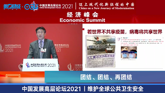 在2021中国发展高层论坛上,中国疾病预防控制中心主任高福强调,消灭新冠要靠疫苗,疫苗消灭了天花,消除了小儿麻痹,所以我们要相信疫苗,但是疫苗必须全球共享。“如果世界不共享疫苗,病毒将共享世界。”他高呼:“团结、团结、再团结!”