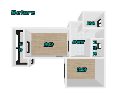 1. 将客餐厅与次卧的隔墙向次卧推1.5米,将次卧的采光窗包入客餐厅,「暗厅」变「明厅」。