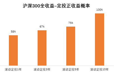 为何要定投?因为这样赢面更大,定投一年,正收益的概率是58%,定投五年,正收益的概率是75%,但是如果定投十年,正收益的概率便是100%。