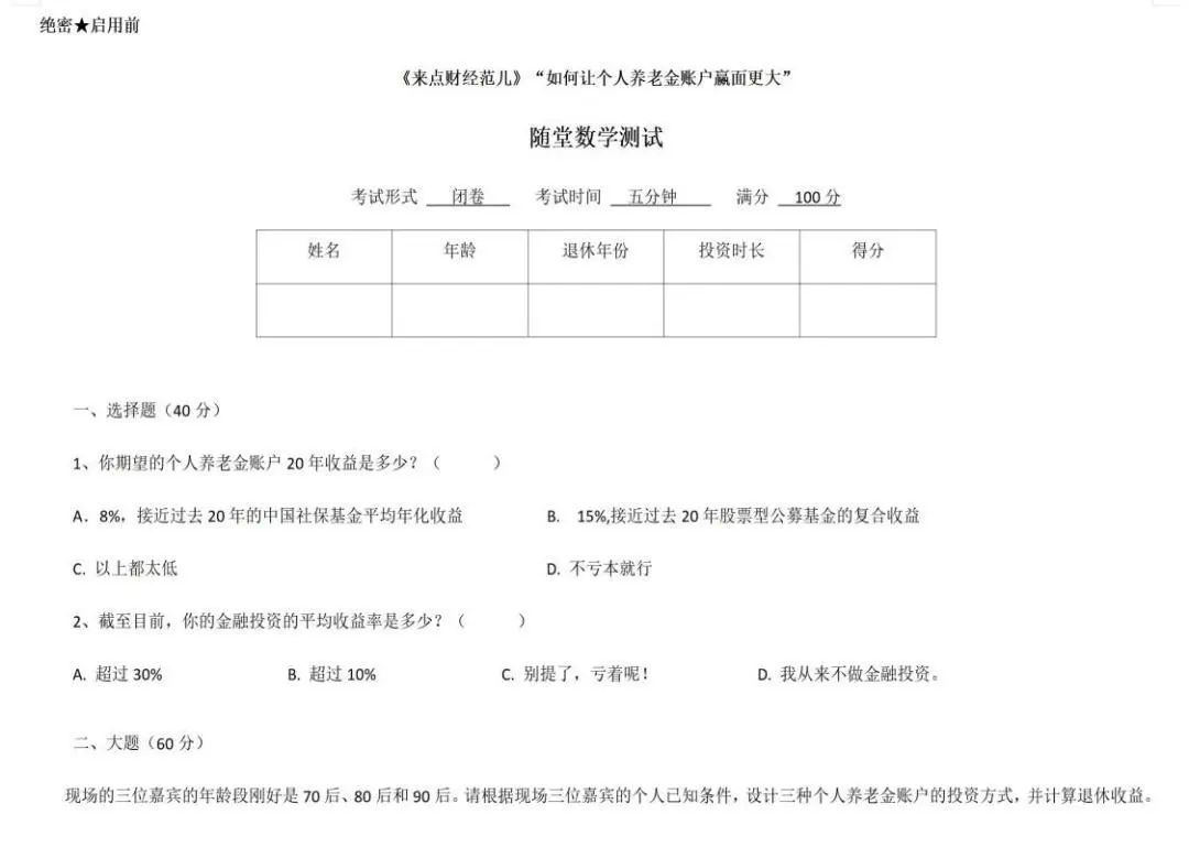 为了说明老有所养必须今天付出10倍脑汁,也为了说明投资赚钱永远关乎具体计算,导演特意在节目中出了张数理性很强的考卷: