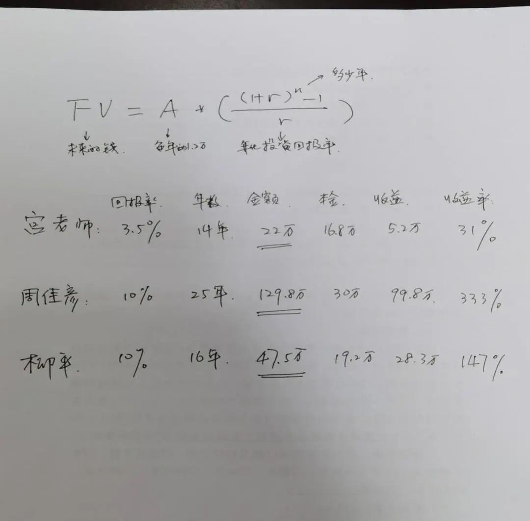 好了,直接看下我们本期节目的硬核计算吧。看过了结果,你是不是能体会到想要体面养老、想要通过投资理财赚钱,必须耗费10倍的脑汁、走上一条数学计算的不归路才行呢?上图!看计算结果: