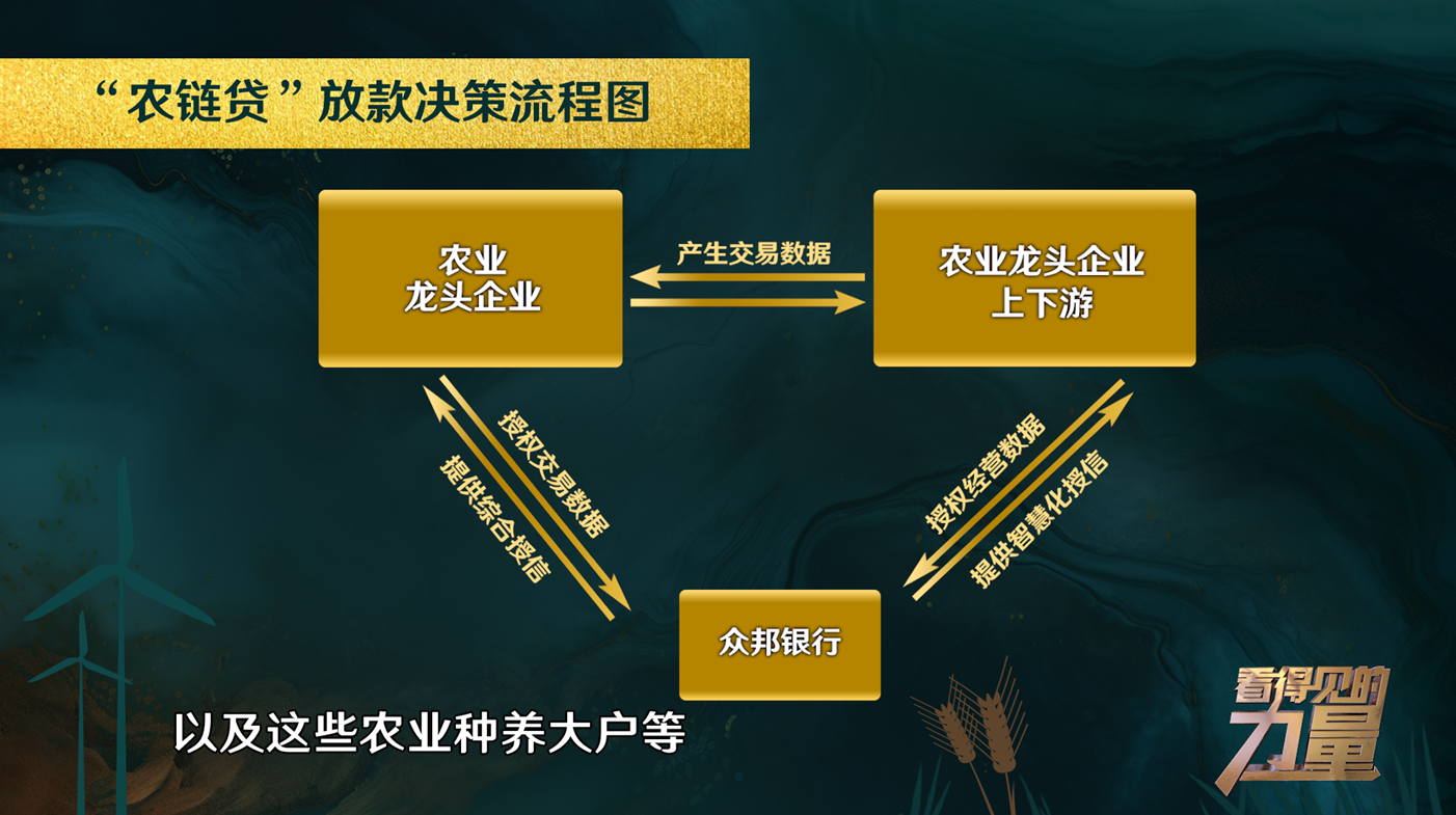众邦银行董事长程峰:从2021年开始,我们就推出了专属的产品“农链贷”,通过与农业产业化链条上的核心企业以及B2B的平台、地方政府的合作,基于真实的交易背景、交互信息流、资金流、物流等数据,为链上的小微企业、个体工商户,以及这些农业种养大户等,提供智慧化的授信。将信贷资金聚集到链条最末端的小微企业,打通了小微企业最后一公里的难题。