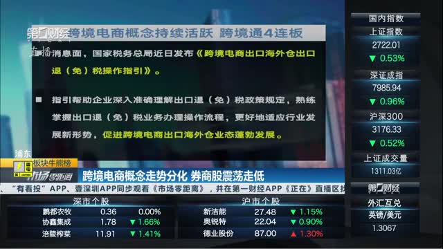 A股跨境电商概念早盘走势分化,跨境通4连板,汇鸿集团涨停,狮头股份、星徽股份、三态股份、南极电商等跟涨。保险、证券股震荡走低,天茂集团跌停,国海证券、天风证券、长江证券、中原证券、首创证券等跟跌。