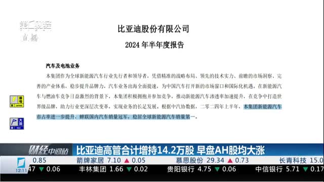 比亚迪大额增持。9月10日晚间,比亚迪发布公告,公司多位高管及核心人员近日以集中竞价交易方式增持14.2万股公司股份,增持金额合计3545.36万元。今天早盘,A股市场上,比亚迪大涨超3%。港股市场上,涨幅超2%。