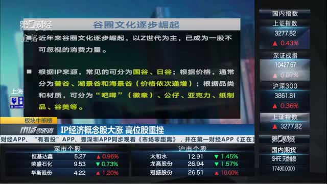 今天早盘,IP经济概念股集体大涨,奥飞娱乐、华立科技、实丰文化、广博股份等多股涨停。高位股大跌,有研新材、大千生态、六国化工、渤海化学等跌停。