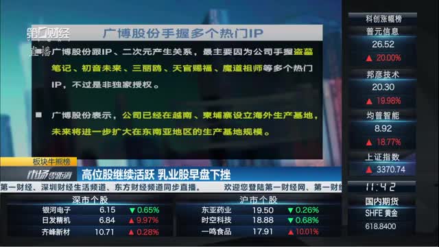 高位股继续活跃,南京化纤涨停走出12连板,广博股份10连板,华胜天成9连板,桂发祥8连板,远达环保、真爱美家、洪兴股份等多只人气股涨停。乳业板块早盘下挫,欢乐家跌超10%,品渥食品、骑士乳业、麦趣尔、庄园牧场等纷纷下挫。