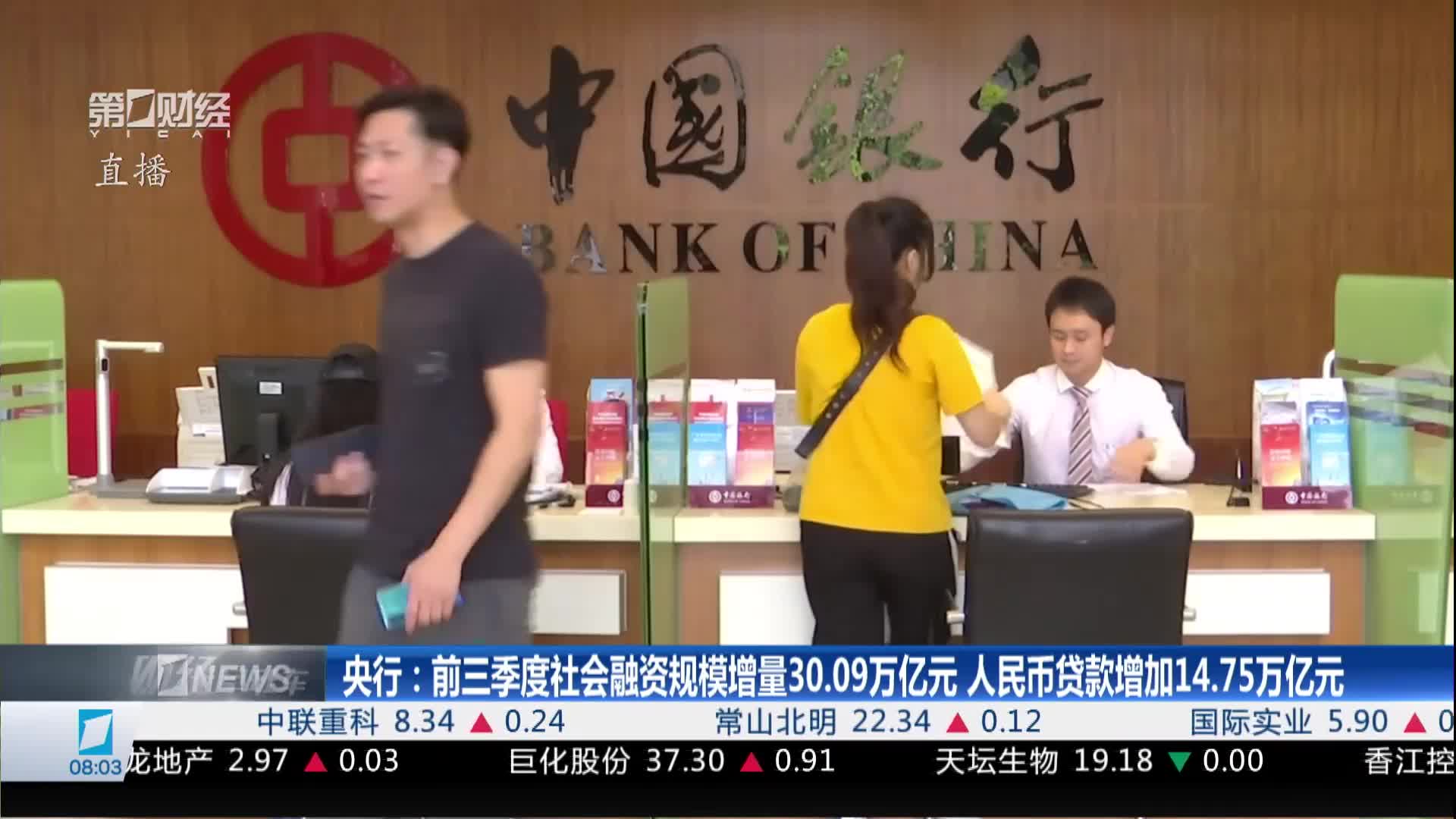 央行:前三季度社会融资规模增量30.09万亿元 人民币贷款增加14.75万亿元