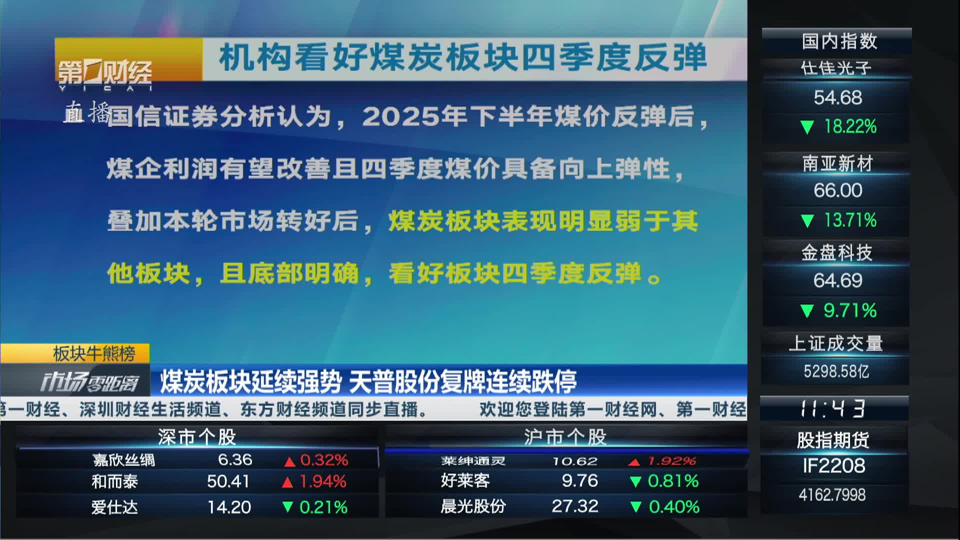 煤炭板块延续强势,大有能源6天5板,安泰集团2连板,云维股份、云煤能源、陕西黑猫等跟涨。天普股份复牌后连续两个交易日跌停,此前曾连续走出15个涨停。