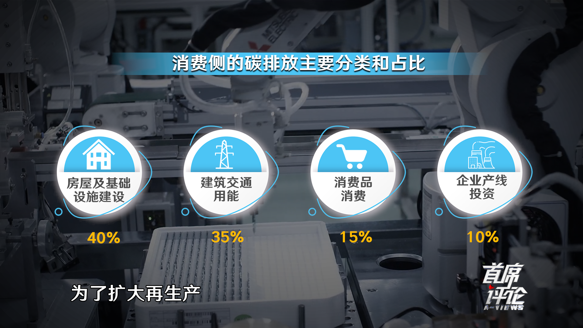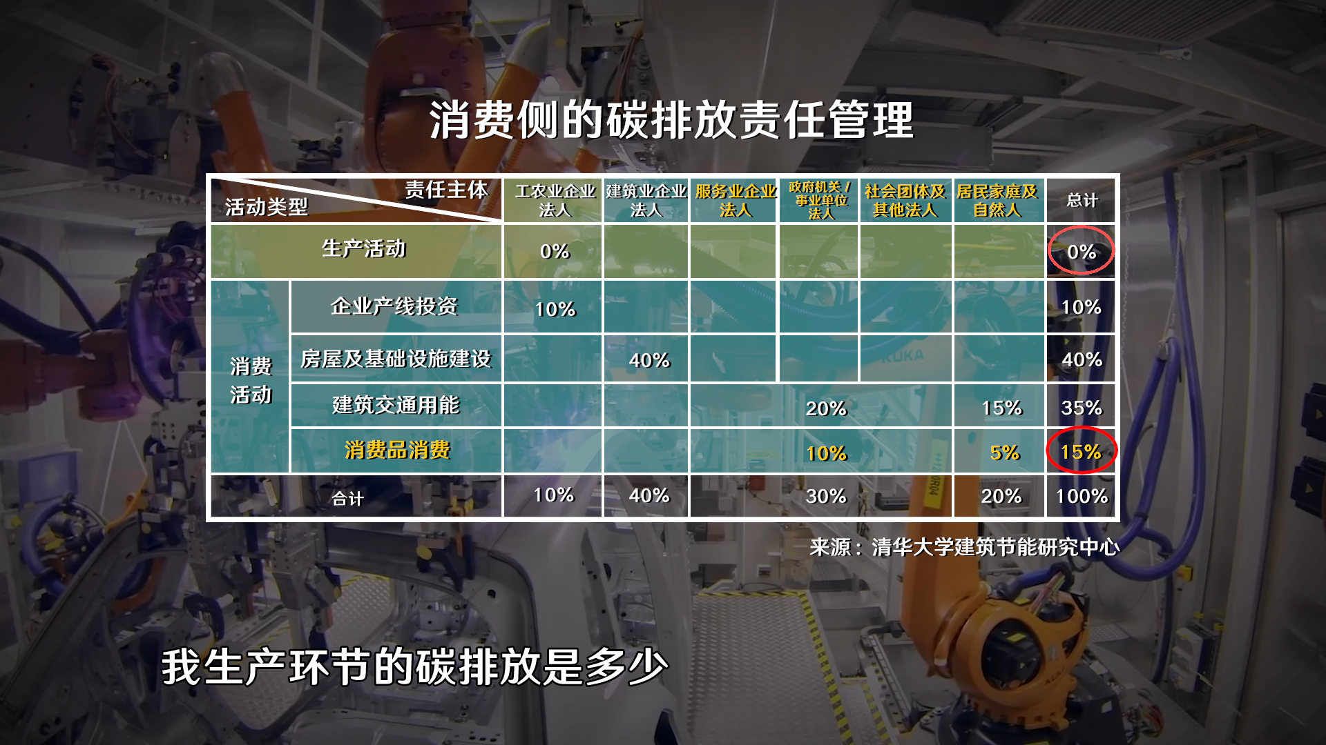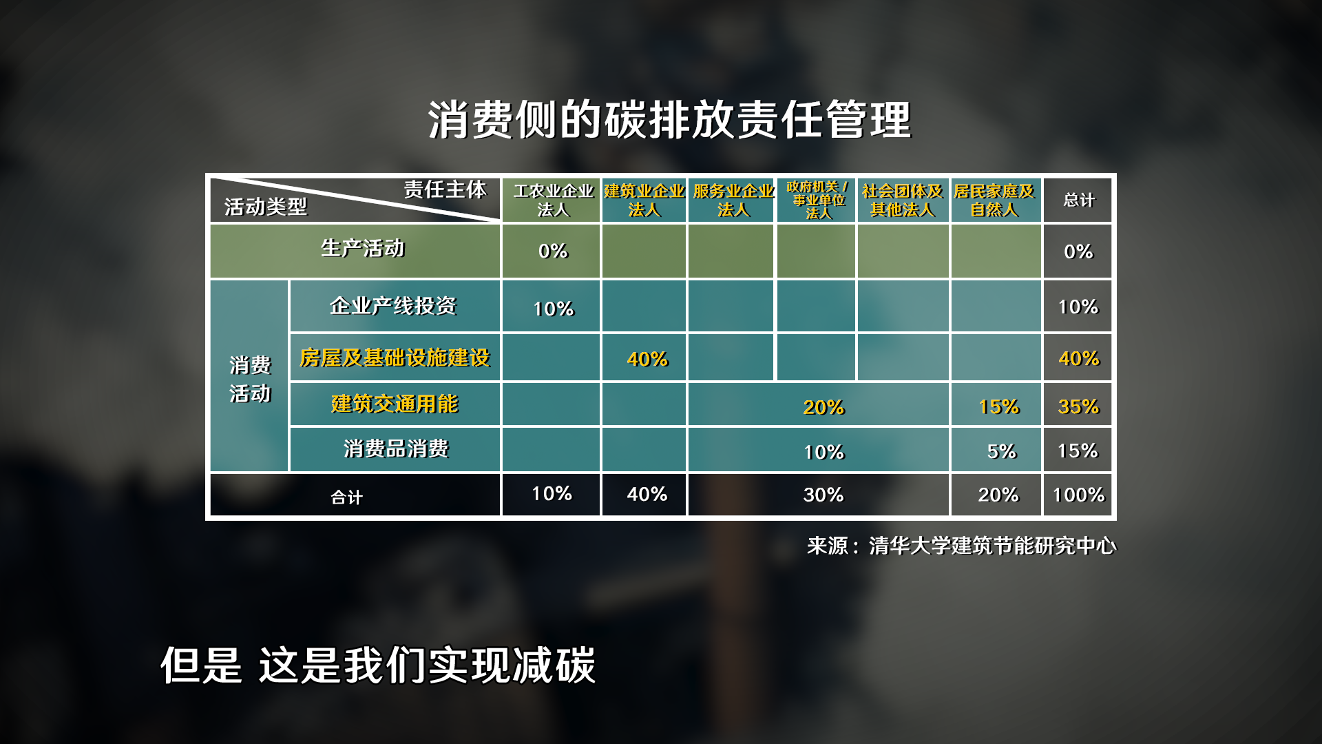 还有10%是生产企业为了扩大再生产,上的新的生产线、生产装备,因为用了钢铁,用了各种材料,它有碳排放,它占10%,这样加起来是100%了。这个100%不是100%的中国碳排放,中国使用能源的碳排放,实际里面大概有15%-20%,它是作为产品的出口了,得把这刨掉,剩下这85%-80%,这是在国内用的。减少碳排放,你得先看大头,一个是房屋及基础设施建设,一个就是日常运行,这两个特点完全不一样,但是这是我们实现减碳和实现未来碳中和(消费侧)最主要的领域。