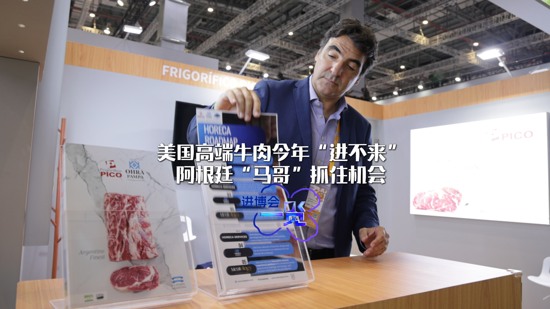 在第八届进博会,一位三次参加进博会的牛肉出口商“马哥”马海牛,谈到了今年参展的新目标:由于中美贸易摩擦,美国高端牛肉今年很多“进不来”,这为阿根廷牛肉创造了一个绝佳的“窗口期”。因此,他此行的目标非常明确,就是希望借助进博会这个大平台,加速推广高品质的阿根廷谷饲牛肉,抓住时机抢占中国市场的空白份额。他透露,进入中国市场五年来,出口量占比已经从0%上升到了60%。直击展会,一览全知!