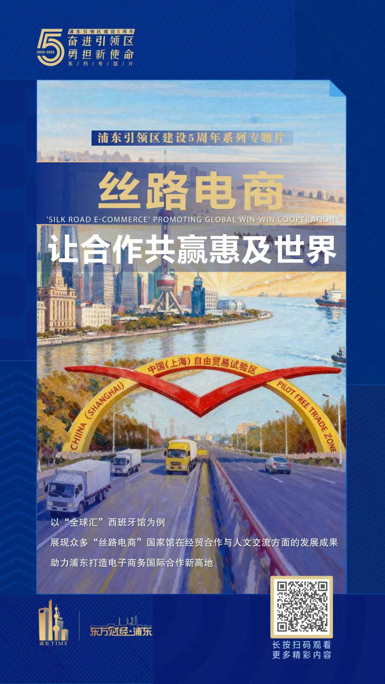 第四集《“丝路电商”让合作共赢惠及世界》,节目以“全球汇”西班牙馆为案例引入,展现众多“丝路电商”国家馆在经贸合作与人文交流方面的发展成果,作为上海自贸试验区拓展新型国际贸易功能的重要载体,持续深化与“一带一路”沿线国家、“丝路电商”伙伴国的经贸合作,助力浦东打造电子商务国际合作新高地。