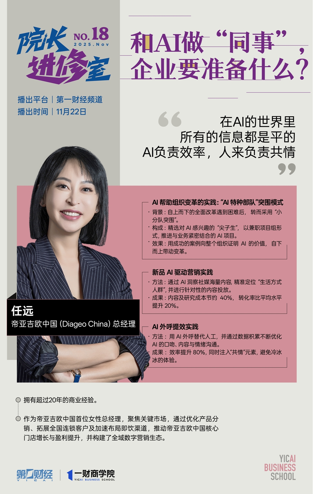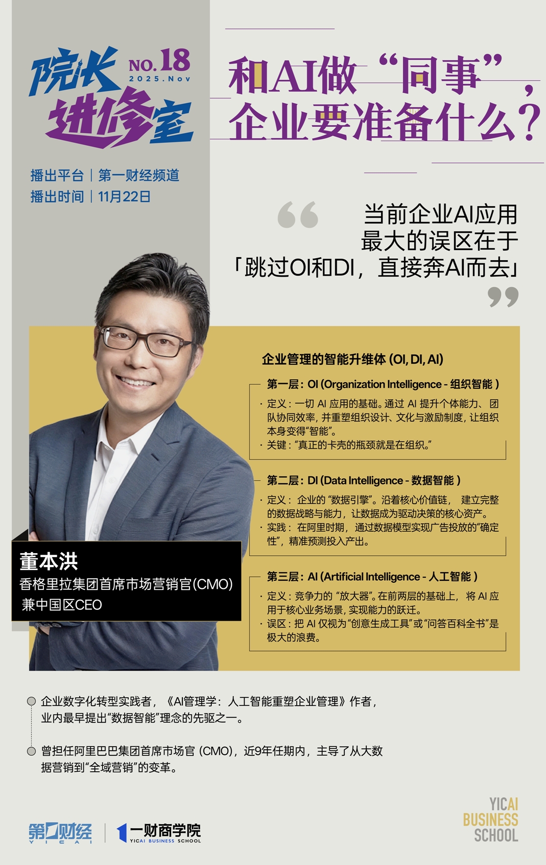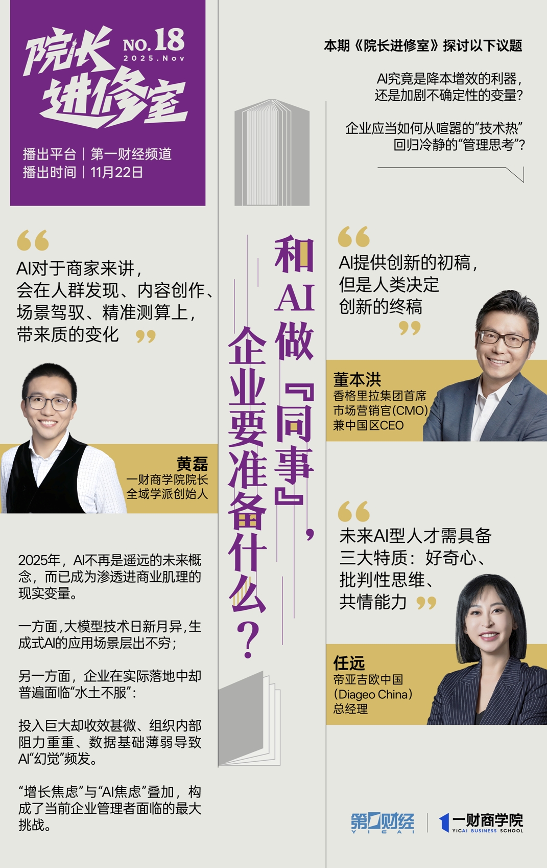 正是在这个AI发展进入下半场、从狂热走向理性的关键节点,第18期《院长进修室》应时而生。我们邀请到两位真正站在变革风暴中心的顶级操盘手——香格里拉集团CMO兼中国区CEO董本洪(Chris)与帝亚吉欧中国总经理任远(Rita),与一财商学院院长黄磊共同探寻AI时代的管理之道。