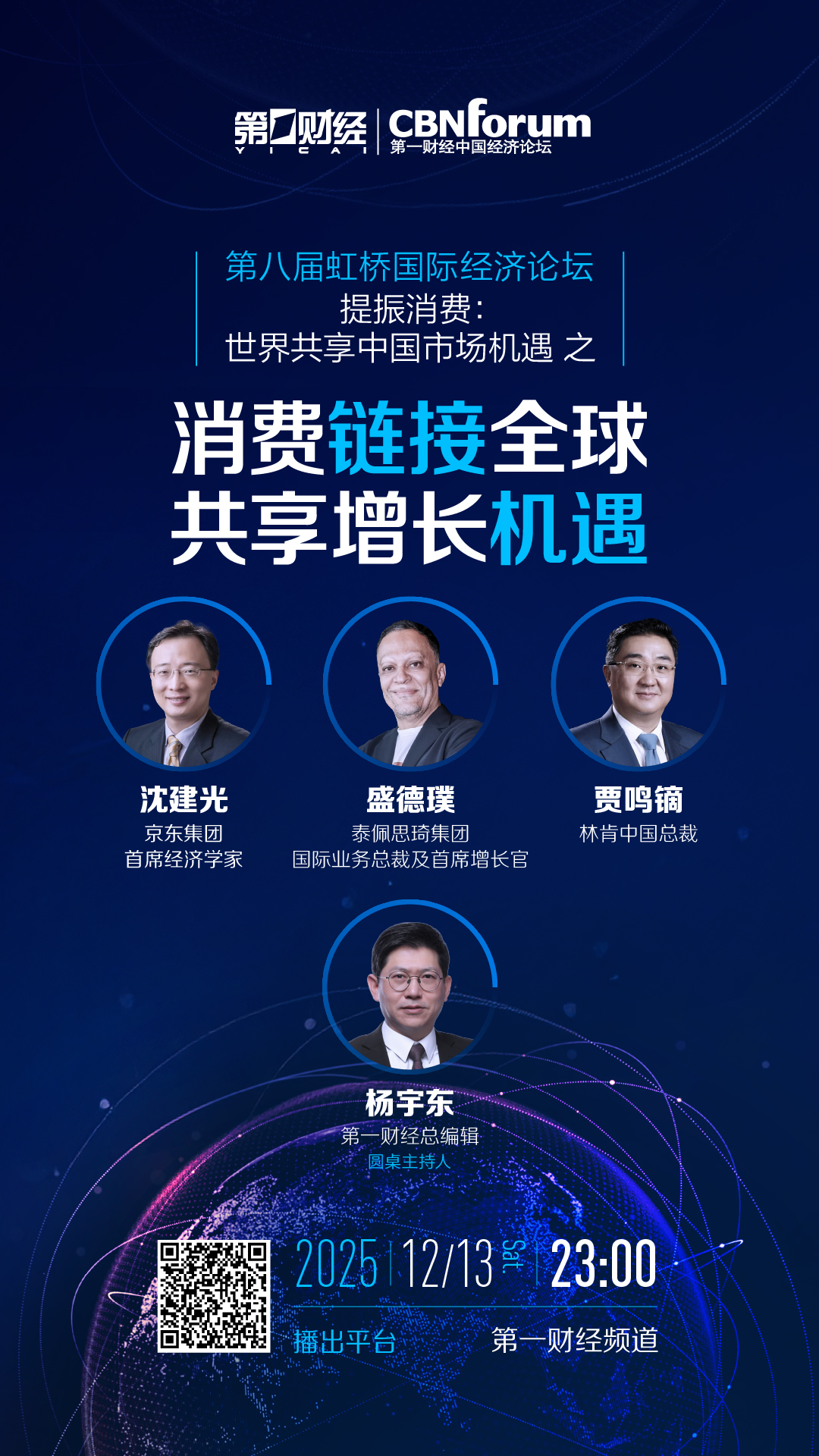 本期的第一财经·中国经济论坛节目呈现的是第八届虹桥国际经济论坛“提振消费:世界共享中国市场机遇”分论坛电视专场的精彩内容。京东集团首席经济学家沈建光,泰佩思琦集团国际业务总裁及首席增长官盛德璞,林肯中国总裁贾鸣镝,和第一财经总编辑杨宇东将围绕着“消费链接全球 共享增长机遇”的主题进行深入探讨。