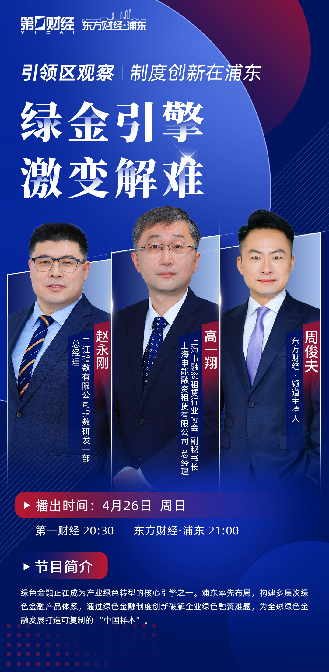 《引领区观察》是第一财经和东方财经联合制作播出的大型访谈栏目。栏目通过“演播室访谈+多元视频板块”结合的方式,深度聚焦浦东的创新引领探索。每集节目25分钟,在第一财经频道和东方财经•浦东频道周日晚黄金时间同步播出。