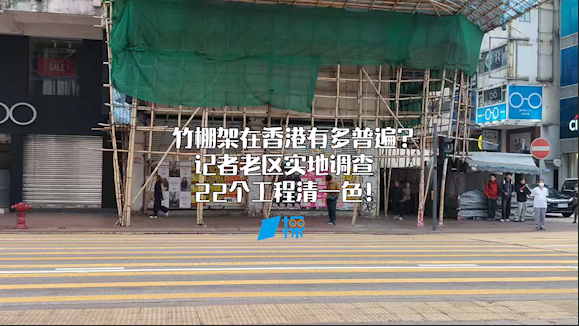 第一财经记者实地走访发现,所见到的22个维修工程全部使用竹棚架,没有一处金属棚架。现场竹材看似未经防火处理,干燥易燃,而香港当日正发布红色火灾风险警告。